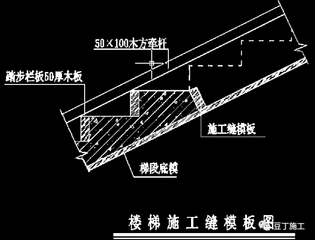 楼梯上的施工缝应留在踏步板的1/3 处(或至少三个踏步),但要注意接缝面应斜向垂直于楼梯轴线方向。 如下图所示: