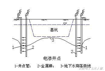 电渗井点适用于渗透系数很小的地质情况,如渗透系数小于0.1m/d的粘土、亚粘土、淤泥和淤泥质粘土等。它需要与轻型井点或喷射井点结合应用,在降水过程中,应对电压、电流密度和耗电量等进行量测和必要的调整,工作起来比较烦琐。