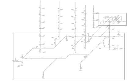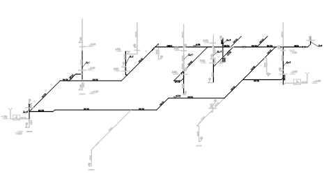 综合楼给排水工程施工图的消火栓给水管道系统图,水施-13,我们会发现在图面上一层部分与负一层的内容混杂在一起,而且管道的走向较复杂。我们同样处理。依据图纸中的地面图标:,保留系统图中的一层内容。把其他楼层的内容淡化,得到下图: