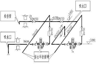 (4)接入环状管网的管道标高为-0.700m、水泵吸入口管道标高为-3.900m,压出口标高-3.840m、水泵吸入口在穿越水池壁时,预埋柔性防水套管。