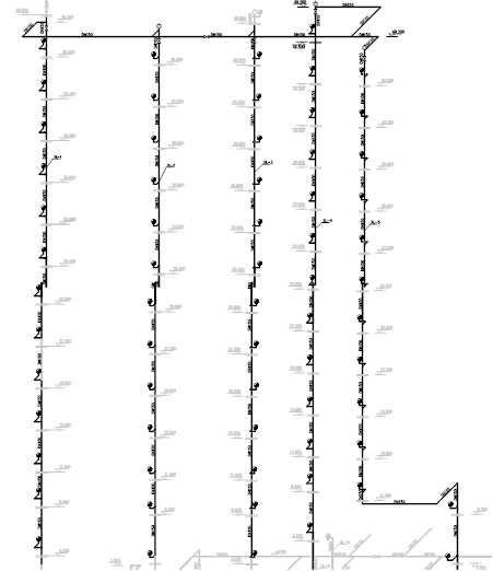 通观本教材所提供的某综合楼给排水工程施工图的消火栓给水管道系统图,水施-13,我们会发现在二层及其以上部分管道相当整齐。我们同样处理。保留系统图中的二~十四层内容。把其他楼层的内容淡化,得到下图: