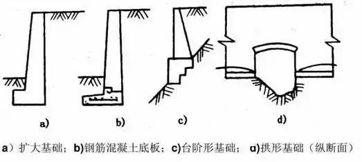 当地基承重力不足且墙趾处地形比较平坦,而墙身又超过一定高度时,为了减小基底压应力和增加抗倾覆稳定性,常常采用扩大基础。当地基压应力超过地基承载力过多时,需要加宽值较大,为避免加宽部分的台阶过高,可采用钢筋混凝土底板。地基为软弱土层时,可采用砂砾、碎石、矿渣或者灰土等材料予以换填。当挡土墙修筑在陡坡上,而地基又为完整、稳固、对基础不产生侧压力的坚硬岸石时,可设置台阶基础,以减少基坑开挖和节省圬工。如地基有短段缺口(如深沟等)或挖基困难(如需水下施工)可采用拱形基础。2)基础埋置深度对于土质地基,基础埋置深度应符合下列要求:①无冲刷时,应在天然地面以下至少1m;②有冲刷时,应在冲刷线以下至少1m;③受冻胀影响时,应在冻结线以下不少于0.25m;当冻深超过1m,采用1.25m,但地基应夯填一定厚度的砂石或者碎石垫层,垫层底面亦应位于冻结线以下不少于0.25m。碎石、砾石和砂类地基,不考虑冻胀影响,但地基埋深不宜小于1m。对于基石地基应清除表面风化层,将基底嵌入岩层一定深度,当风化层较厚难以全部清除表面时,可依据地基的风化程度及容许承载力将基底埋入风化层中。当挡土墙位于地质不良地段,地基土内可能出现滑动面时,应进行地基抗滑稳定性验算,将基础底面埋置在滑动面以下,或采取其他措施,以防止挡土墙滑动。基础应采用明挖基础,当基底位于大于5%的纵向斜坡上,基底应该设置成台阶形。