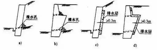 浆砌块(片)石墙身应在墙前地面以上设一排泄水管(图a);墙高时可在墙上部加设一排泄水孔(图b),泄水孔尺寸可视泄水量大小分别采用5cm10cm、10cm10cm、15cm20cm的方孔,或直径5~10cm的圆孔。孔眼间距一般为2~3m;对于浸水挡土墙孔眼间距一般为1.0~1.5m,干旱地区可适当加大,孔眼上下错开布置,下排水孔的出口应高出墙前地面或墙前水位0.3m。