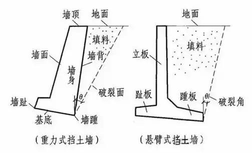 重力式挡土墙和悬臂式挡土墙的示意图: