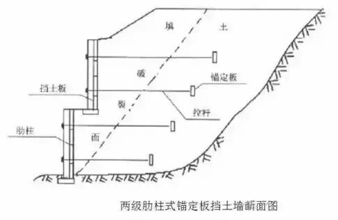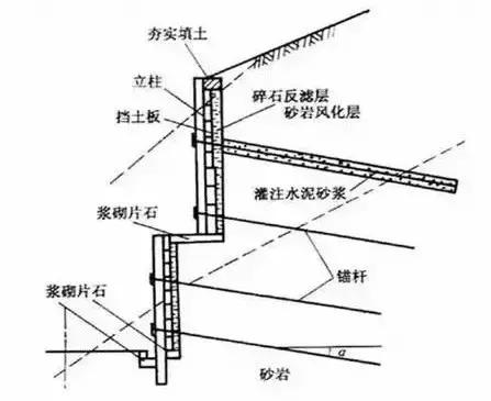 锚杆式挡土墙:由预制的钢筋混凝土立柱、挡土板构成墙面,与水平或倾斜的钢锚杆联合组成。锚杆的一端与立柱连接,另一端被锚固在山坡深处的稳定岩层或土层中。