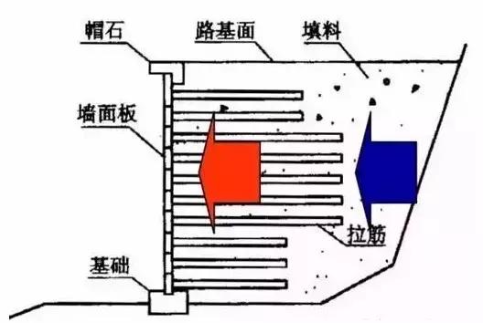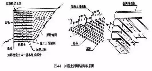 4)加筋土挡土墙:是在土中加入拉筋,利用拉筋与土之间的摩擦作用,改善土体的变形条件和提高土体的工程特性,从而达到稳定土体的目的。由面板、拉筋组成,依靠填土、拉筋之间的摩擦力使填土与拉筋结合成一个整体。