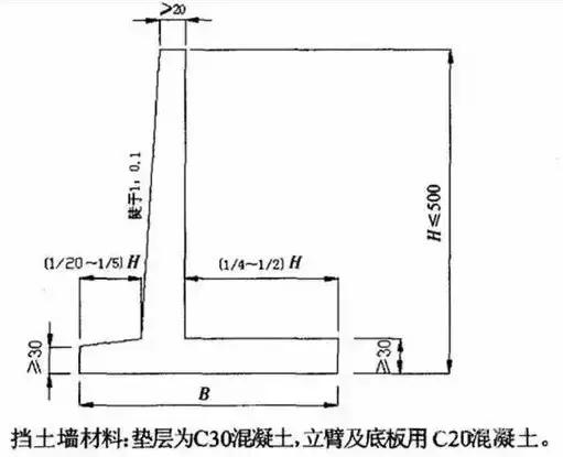 悬臂式挡土墙:由立板(墙面板)和底板(墙趾板和墙踵板)两部分组成,一般形式为如下图所示: