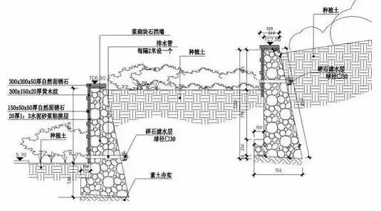 俯斜墙背适用于路堤墙、路肩墙,常用1:0.15~1:0.25,不超过4m的低墙可以用垂直墙背。凸形折线墙背多用于路堑墙,也可以用于路肩墙,上下墙的墙高比一般采用2:3。衡重式墙适用于山区地形陡峻处的路肩墙和路堤墙,也可用于路堑墙,上墙俯斜墙背的坡度在1:0.25~1:0.45,下墙仰斜墙背在1:0.25左右,上下墙的墙高比一般采用2:3。2)墙面墙面一般均为平面,起坡度应与墙背坡度相协调。墙面坡度直接影响挡土墙的高度,因此,在地面横坡较陡时,墙面的坡度一般为1:0.05~1:0.20,矮墙可采用陡直墙面;地面较平缓时,一般采用1:0.20~1:0.35较为经济。3)墙顶墙顶宽度最小,浆砌挡土墙不小于50cm,干砌不小于60cm。浆砌路肩墙墙顶一般宜采用粗石料或者混凝土做成顶帽,厚度为40cm;如不做顶帽,对路肩墙和路堑墙,墙顶应以大石块砌筑,并用砂浆勾缝,或用5号砂浆抹平顶面,砂浆厚2cm。干砌挡土墙墙顶在50cm高度内,应用25号砂浆砌筑,以增加墙身稳定性,干砌挡土墙的高度一般不宜大于6m。4)栏杆为保证交通安全,在地形险峻地段或者过高过长的路肩墙的墙顶应设置护栏,为保持土路肩最小宽度,护栏内侧边缘距路面边缘的距离,二、三级路面不小于0.75m,四级路不小于0.5m。护栏分墙式和柱式两种,所采用的材料、护拦高度和宽度,视实际需要而定。