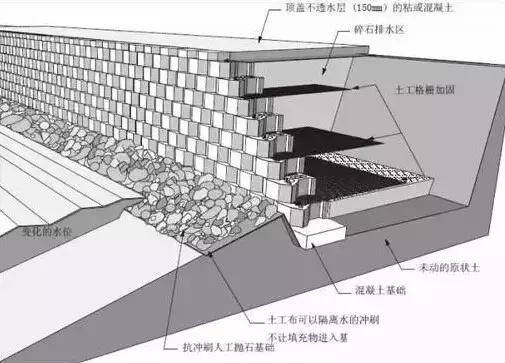 浸水挡土墙:沿河路堤,在傍水的一侧设置挡土墙,可以防止水流对路基的冲刷和侵蚀,也是减少压缩河床的有效措施。