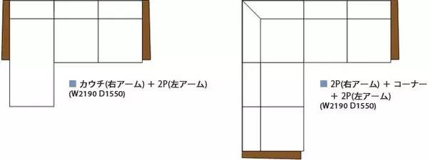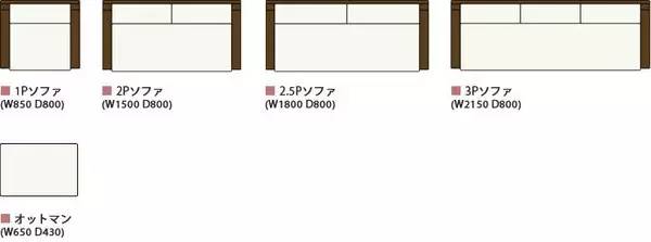 例如图中是一些标准模块,长度(W)和宽度(D)都标注了。单人使用通常选择1.5p模式,长度为1250,双人用为1550,比较富裕一点的话可以用2.5p即1850长度,三人沙发则为2150。这些模块可以自由组合形成不同的式样。