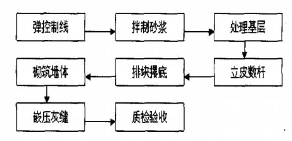 在对填充墙进行施工时,正确的施工顺序是确保施工有序进行的关键,为此,施工人员应当了解填充墙的施工顺序。图1是填充墙施工的标准工艺流程,按照这个顺序进行施工作业,并掌握各道工序的施工注意要点,可以保证填充墙的整体质量。