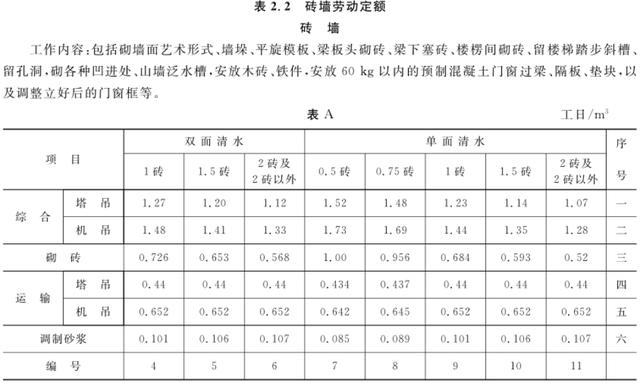 现行的劳动定额是《建设工程劳动定额建筑工程》。本标准分为十一个分册:材料运输及加工工程,人工土石方工程,架子工程,砌筑工程,木结构工程,模板工程,钢筋工程,混凝土工程,防水工程,金属结构工程,防腐、隔热、保温工程。改变了传统劳动定额的形式。变传统的复式表现形式为单式表现形式,即采用时间定额(工日/XX)表示。