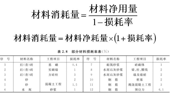 材料消耗量可依据材料净耗量及损耗率来确定,其计算公式为: