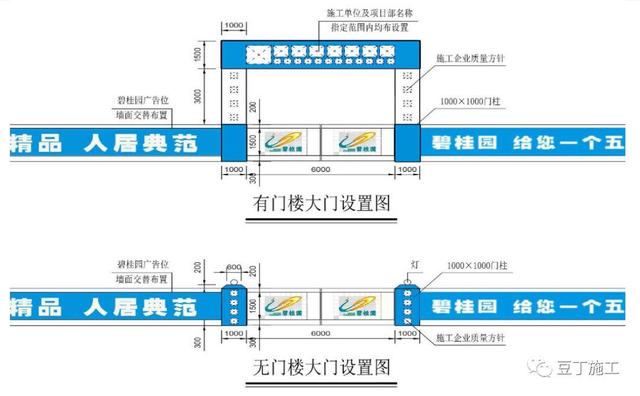 1、主出入口必须设置大门(门扇均设碧桂园集团LOGO,若采用伸缩门,可将碧桂园集团LOGO印制在门柱两侧围墙上,大门两侧围墙均设碧桂园集团专用标语,主色标准蓝色。
