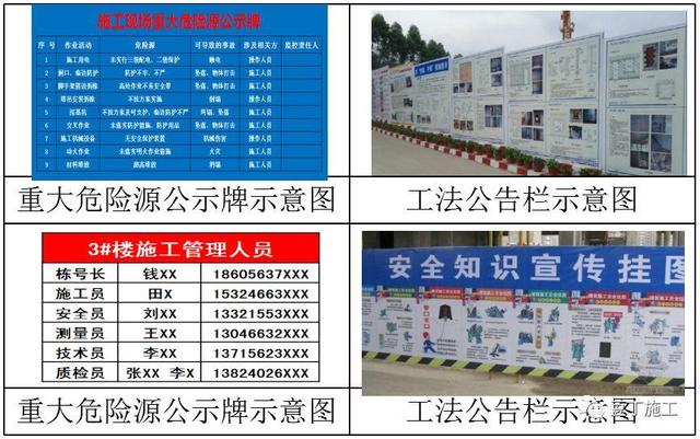 1、施工现场集中设置公告牌。如工程概况牌、项目管理人员责任牌、消防防火责任牌、安全生产责任牌、文明施工和环境保护牌、重大危险源公示牌及施工现场总平面布置图、工程施工进度图等。