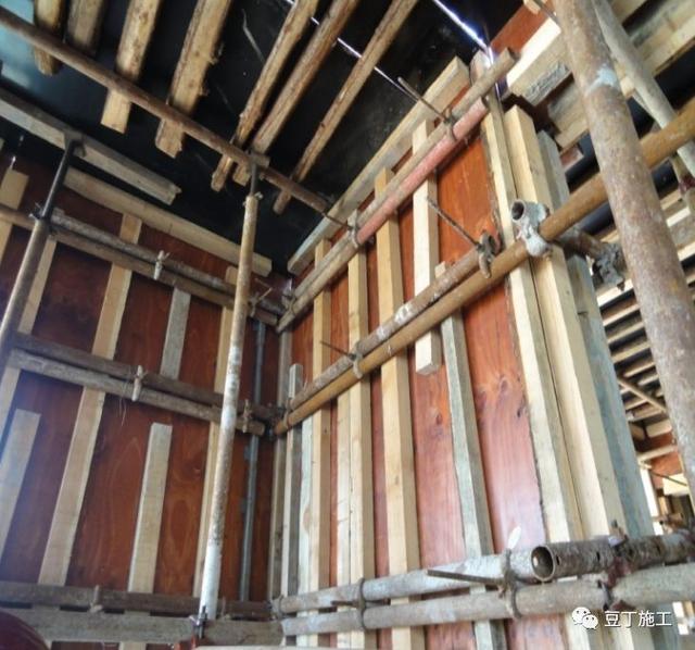 2、剪力墙模板一次拼装至板底,用钢管、方木及对拉螺栓进行加固,方木采用立铺方式,表面用电刨刨平,提高加固强度,拼缝紧密,保证剪力墙表面平整,棱角顺直 。