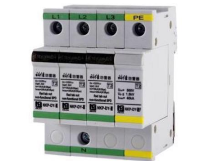 TT系统中浪涌保护器的接线图,TT系统是电源系统有一点直接接地。设备外露导电部分的接地与电源系统的接地电气上无关的系统。科佳电气产品中的3P+1浪涌保护器都是以此为标准设计的,三相四线,上面三个L口分别连接三条火线,下面的N口接PEN线,右侧的PE接地线。