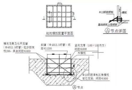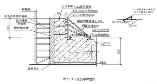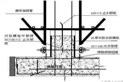筏板上翻外梁墙基础模板,一般采用12-15mm厚木(竹)低档次多层板事先拼装而成,外帮木方作横竖背楞,水平向间距30~1000mm,竖楞间距100~3750mm;当上翻梁墙模高50cm时,按施工方案要求设置拉模杆,拉模杆上焊接40止水环;底部每隔100~3750mm设置一道托模杆,托模杆由钢筋下脚料制作而成;竖向采用48短钢管或25钢筋作锁模架,间距120~3750mm;外导墙按设计要求设置300宽止水钢板或止水槽等。
