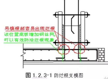 墙柱单侧或两侧为吊模时,在阴角根部的位置增加钢丝网可有效防治烂根现象