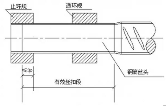 钢筋丝头螺纹的有效旋合长度用专用丝头卡板或专用卡尺板检测,允许偏差不大于1P。