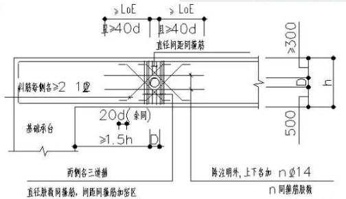 当在基础承台梁上开洞时洞口尺寸Dh/5,连续开洞净距4D;当在框架梁上开洞时洞口尺寸Dh/5,且150mm,连续开洞3D。