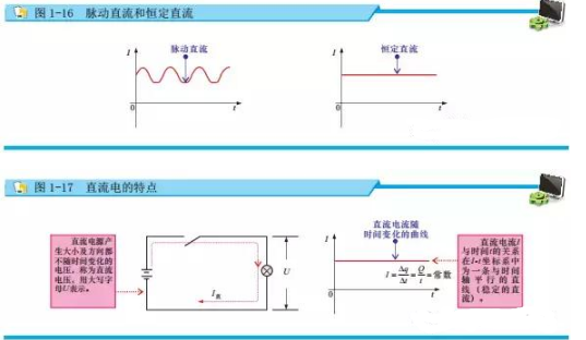 直流电可以分为脉动直流和恒定直流,如下图所示,脉动直流中电流大小不稳定;而恒定直流中的电流大小是恒定不变的。