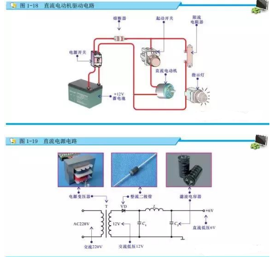 在生活和生产中电池供电的电器都属于直流供电方式,如低压小功率照明灯、直流电动机等。还有许多电器是利用交流-直流变换器,将交流电变成直流再为电器供电。下图是一个典型的直流电路。