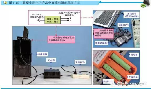 一些实用的电子产品(如手机、收音机等)是借助充电器给电池充电后获取电能。不论是电动车的大型充电器,还是手机、收音机等小型充电器,都需要从交流220V的电源中获得能量。还有一些电子产品将直流电源作为附件,制成一个独立的电路单元,称为适配器,如笔记本电脑等。适配器将220V交流电转变为直流电后为用电设备提供所需要的电压。