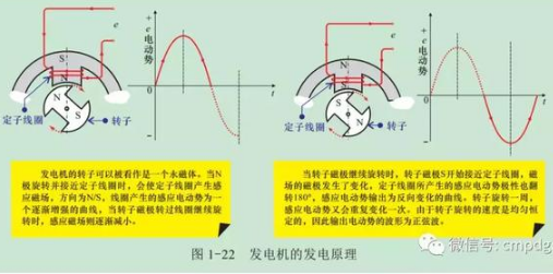 交流发电机的转子是由永磁体构成的,当水轮机或汽轮机带动发电机转子旋转时,转子磁极转动一周就会使定子线圈辐射磁场,磁力线切割定子线圈,定子线圈中便会产生感应电动势,转子磁极转动一周就会使定子线圈产生相应的电动势(电压)。由于感应电动势的强弱与感应磁场的强度成正比,感应电动势的极性也与感性磁场的机型想对应。定子线圈所受到的感应磁场是正反方向交替周期性变化的。转子磁极匀速转动时,感应磁场是按正弦规律变化的,发电机输出的电动势波形为正弦波形。