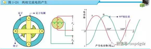 如下图所示,转子旋转时两组定子线圈产生两组感应电动势,这两组电动势之间有90的相位差,这种电源成为两相电源,多用在自动化设备中。