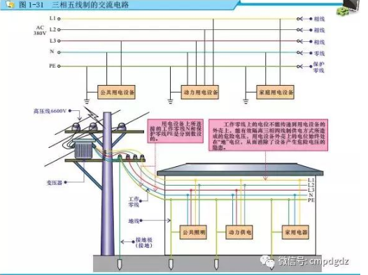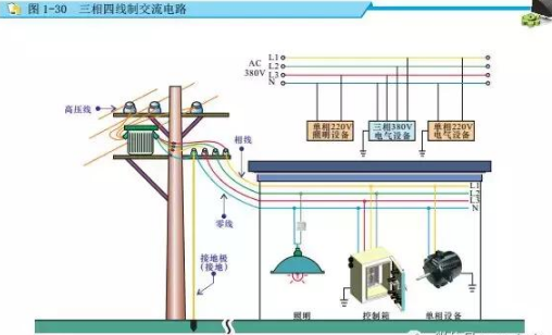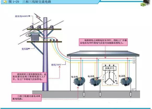 三相三线制:由三根相线构成,每根之间的电压为380V。这种供电方式多用在电能传输系统中。