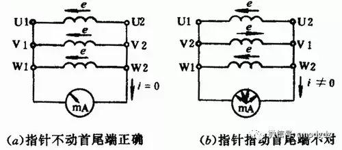 首先用万用表电阻挡分清三相绕组各相的两个线头。给各相绕组假设编号为U1、U2、V1、V2和W1、W2。按下图接线,判断首尾端。用手转动电动机转子,如万用表(微安挡)指针不动,则证明假设的编号是正确的,若指针有偏转,说明其中有一相首尾端假设编号不对,应逐相对调重测,直至正确为止。