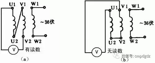通电后,若电压表无读数,说明连在一起的两个线头同为首端或尾端。电压表有读数,连在一起的两个线头中一个是首端,另一个是尾端。任定一端为已知首端,同法可定第三相的首尾端。