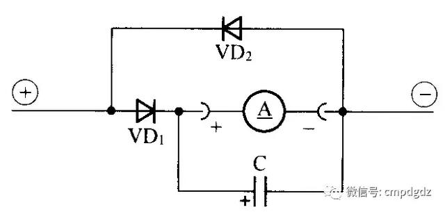图中的电路增加了3个元器件。其中VD1为整流二极管,VD2为交流旁路二极管,C为滤波电容器。直流电流表中通过的是半波整流电流。如果不加负半波旁路二极管VD2,测试结果会偏高一些。当然,如果测试数据要求不高,也可以不设二极管VD2。这样,线路就更简单。如果不加滤波电容器,万用电表的指针会成为振荡状态。