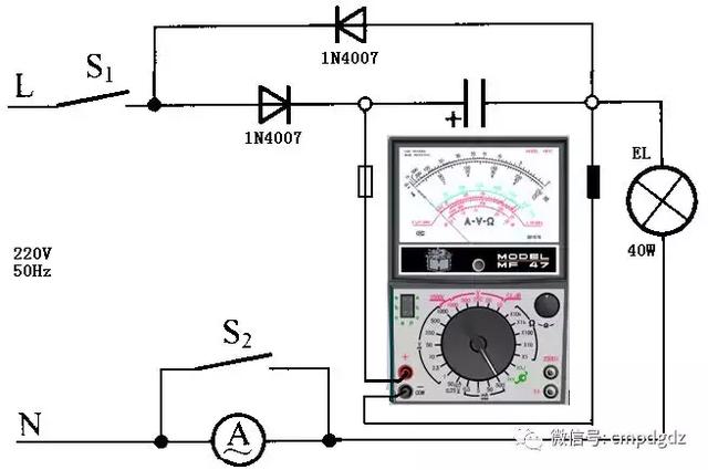 为了便于操作,我们以下图所示的试验电路为例,介绍万用表直流电流挡测试交流电流的基本要领。