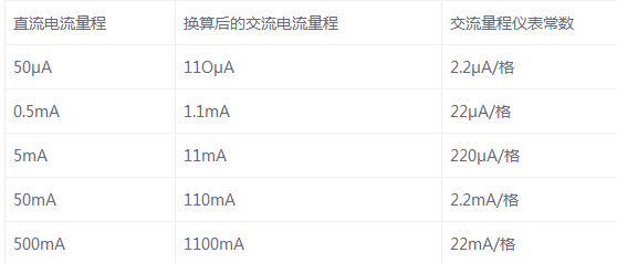 如果使用万用表直流电流挡测试交流电流较为频繁,也可以按万用表直流电流各挡量程范围,求出仪表常数,这样使用起来就很方便。以MF30型万用电表为例,取用半波整流换算系数为0.45,见下表。