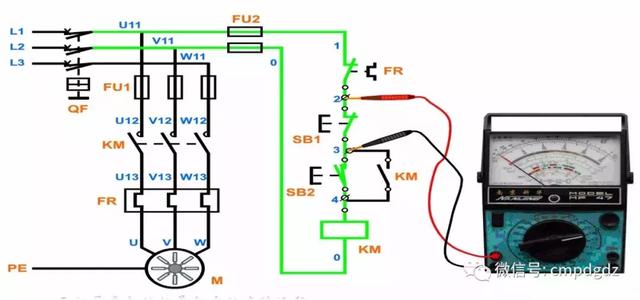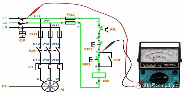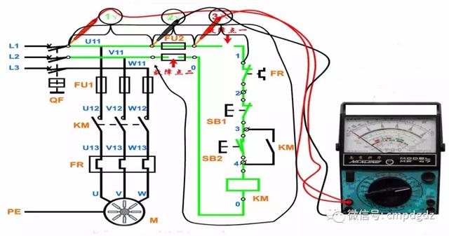 一般把万用表的两支表笔分别接在控制电路的起点即FU2的U11、V11两点(或是FU2的出线点0、1两点),按下按钮、接触器位置开关等元件来模拟控制元件的工作,根据各支路的通断使得所控制的接触器线圈、继电器线圈形成并联或断开,从万电表所指示的阻值变化来判断线路是否正常。