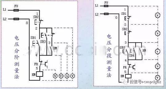 检查电力拖动控制线路时,把万用表选择开关转到500V交流电压档上。电压测量方法可分为分阶段测量法和分段测量法,如下图所示。