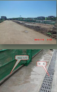 坡顶做散水及挡水墙。四周做混凝土路面保证施工现场水流通常,不积水,周边地区不倒灌。
