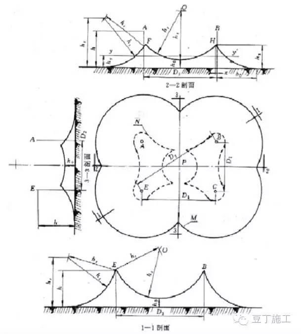 B 、E 接闪杆连线上的保护范围见图4.15.3 的11剖面图,外侧部分按单支接闪杆的方法确定。两杆间的保护范围应按下列方法确定: 以B 、E 两杆杆尖为圆心、hr为半径作弧线相交于O 点, 以O 点为圆心、hr 为半径作弧线, 该弧线与杆尖相连的这段弧线即为杆间保护范围。保护范围最低点的高度ho 应按下式计算: