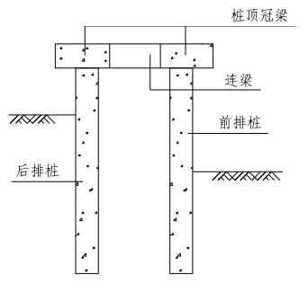 为增大排桩的整体抗弯刚度和抗侧移能力时,可将桩设置成为前后双排,将前后排桩桩顶的冠梁用横向连梁连接,就形成了双排门架式挡土结构。