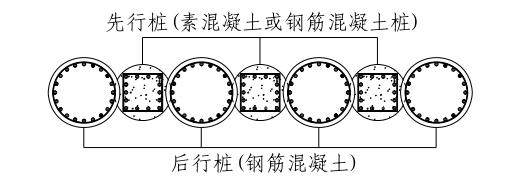 有时因场地狭窄等原因,无法同时设置排桩和隔水帷幕时,可采用桩与桩之间咬合的形式,形成可起到止水作用的咬合式排桩围护墙。咬合式排桩围护墙的先行桩采用素混凝土桩或钢筋混凝土桩,后行桩采用钢筋混凝土桩。