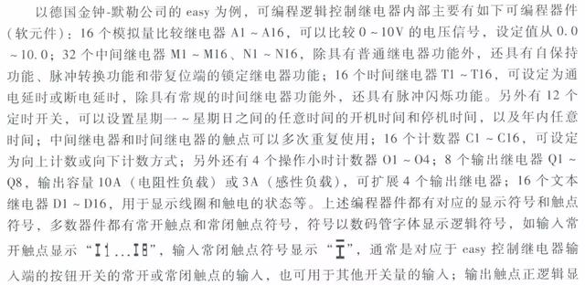 可编程逻辑控制继电器基本型的宽度为72mm,相当于8个模数的尺寸,加长型和总线型的宽度相当于14个模数宽,可卡装在35mm导轨上,不同品牌的基本型产品外形基本相似。以德国金钟-默勒公司的easy为例,基本型的外貌及面板功能布置如图下图所示。