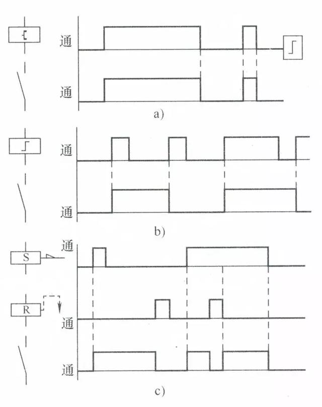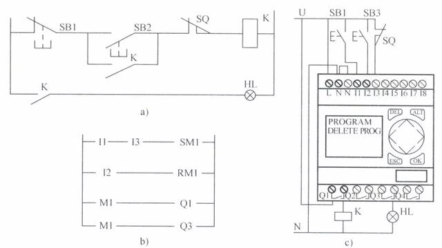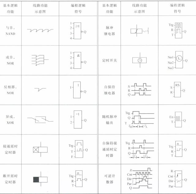 图a是继电逻辑控制线路,图b是输入到easy中的梯形图,图c是接线原理图。梯形图利用了带复位端的闩锁继电器功能来实现,SM1为中间继电器M1的自锁线圈,RM1为其复位线圈;I1、I2是按钮的输入信号,I3是限位开关,按钮和限位开关分別接在easy的输入控制端子上;接触器与指示灯分别接在easy的输出端子上。当按下按钮 SB1 (I1),SM1自锁,若此时限位开关(I3)闭合,输出触点Q1得电,则接通接触器的线圈电源,电动机运转;输出触点Q2也得电,指示灯亮;停止时,按下按钮SB2 (I2),M1复原,电动机停转。由上图可见,其逻辑关系十分明确,简单易懂。需要说明的是,图 中编制的梯形图不是唯一的,亦可利用其他编程元件编制出相同功能的梯形图。限于篇幅,不再多述,需要时请大家参考产品用户手册。下表列出了可编程逻辑控制继电器部分常用逻辑功能块图,供参考,各品牌产品的逻辑功能块图的符号基本相同,有的略有差別。