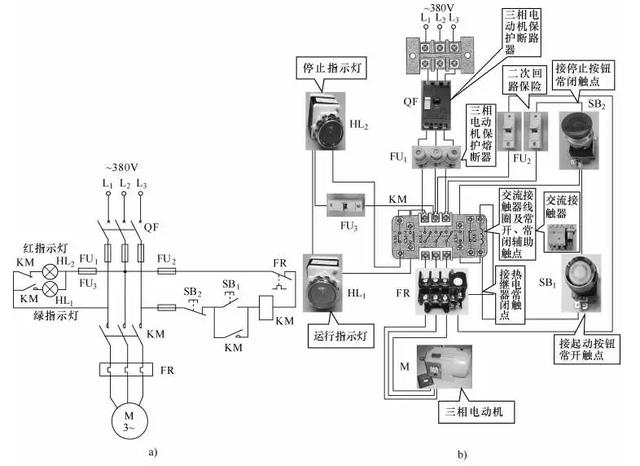 带指示灯的电动机起动停止线路在工作生产中是最常见的一种控制线路,它具有单方向控制电动机起停,并有自锁、短路保护和过载动作保护作用。