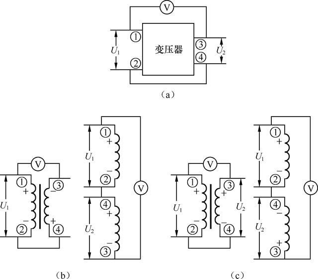 如下图(a)所示,将变压器的一个绕组的一端与另一个绕组的一端连接起来(图中是将②、④端连接起来),再在两个绕组另一端之间连接一个电压表(图中是在①、③端之间连接电压表),然后给一个绕组加一个较低的交流电压(图中是在①、②端加U1电压)。观察电压表V测得的电压值U,如果电压值是两个绕组电压的和,即U = U1 + U2,则①、④端为同名端,其等效原理如下图(b)所示;如果U = U1U2,则①、③端为同名端,其等效原理如下图(c)所示。