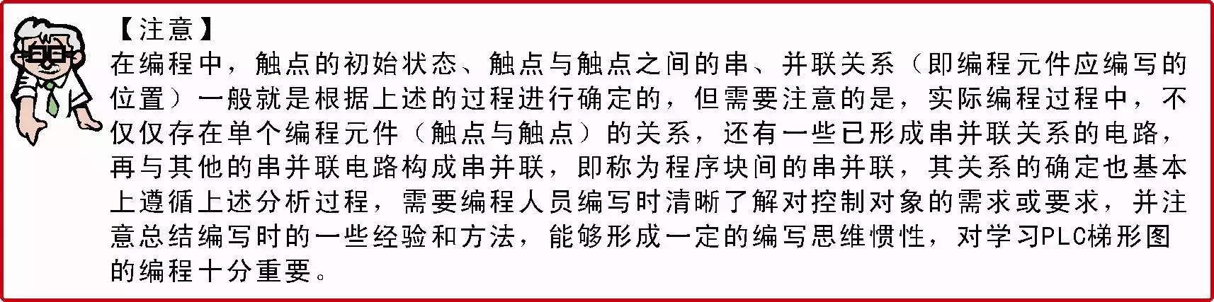 我们看到的PLC梯形图中,一条条程序基本上都是由触点或线圈的串联、并联或某部分程序块的串联、并联等构成的,这些串并联关系构成一定的逻辑关系,因而能够实现特定的控制结果,那么在编程过程中,如何确定触点间或程序块之间是串联关系还是并联关系,是梯形图程序的编程关键,也是程序编写的核心过程。