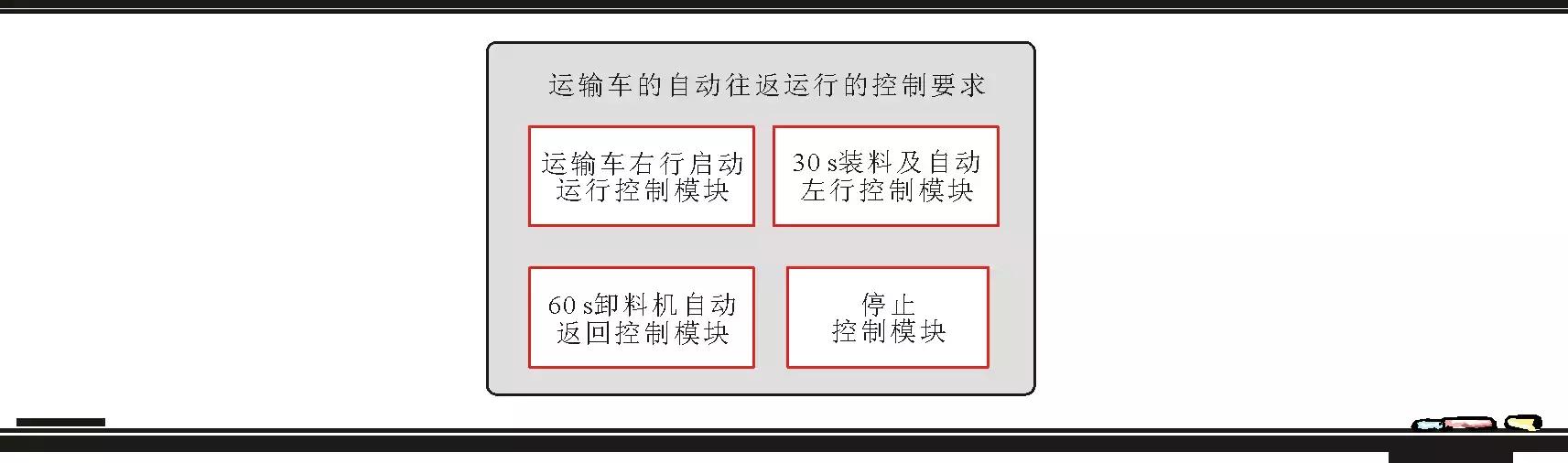 根据运输车的自动往返运行的控制要求,我们可以将功能模块划分为4部分,如下图所示。