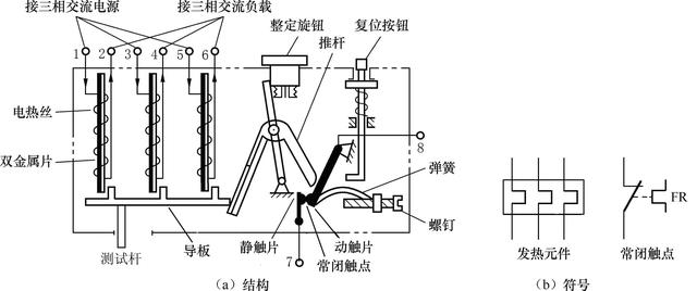 热继电器由电热丝、双金属片、导板、测试杆、推杆、动触片、静触片、弹簧、螺钉、复位按钮和整定旋钮等组成。只有流过发热元件的电流超过一定值(发热元件额定电流值)时,内部机构才会动作,使常闭触点断开(或常开触点闭合),电流越大,动作时间越短。热继电器的发热元件额定电流可以通过整定旋钮来调整。