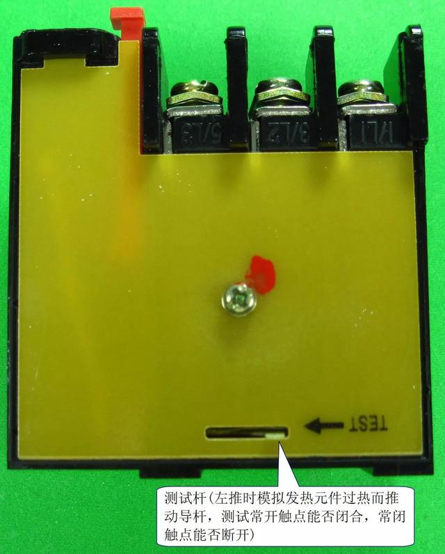 热继电器一般有一个常闭触点和一个常开触点,触点检测包括未动作时检测和动作时检测。检测热继电器常闭触点的电阻如图下所示,第一张图为检测未动作时的常闭触点电阻,正常应接近0,然后检测动作时的常闭触点电阻,检测时拨动测试杆,如第二张图所示,模拟发热元件过流发热弯曲使触点动作,常闭触点应变为开路,电阻为无穷大。